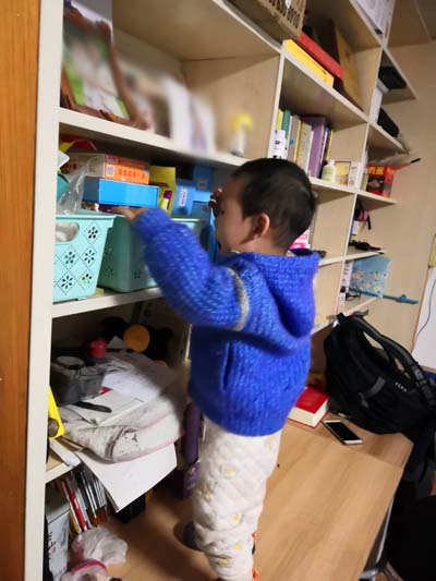 2月份,小灿宝贝就能自己爬上床了。后来能力越来越强,这不,小凳子上大椅子,大椅子再上桌子,桌子上了够书架……