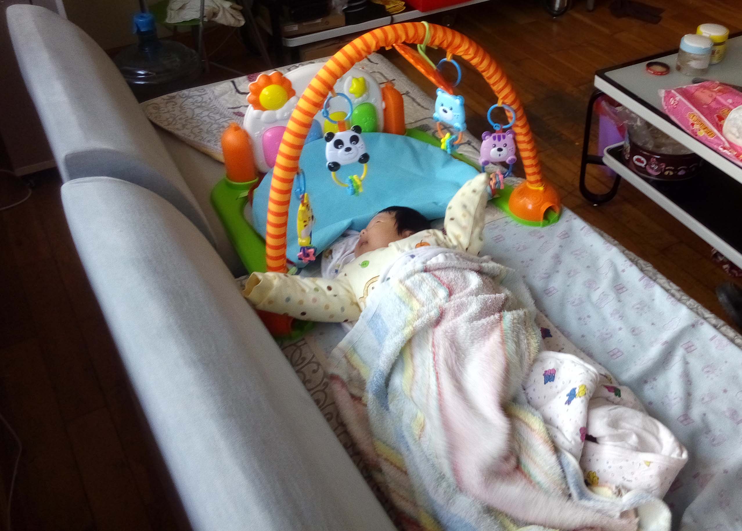 小灿灿长睫毛啦,细细的、翘翘的,非常可爱。而且小不点儿能自己在沙发上躺着 玩健身架了。小手一抓一抓,盯着看看,笑眯眯的,开心极了。