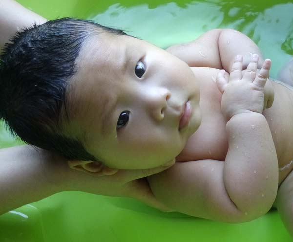 6月下旬,小宝从躺着洗澡享受,变得开始喜欢玩水了。不光小手拨拉水和小玩具,小脚丫子还故意使劲蹬,弄得到处都是水花。蹬完了,还会“咯咯”笑。呵呵呵……