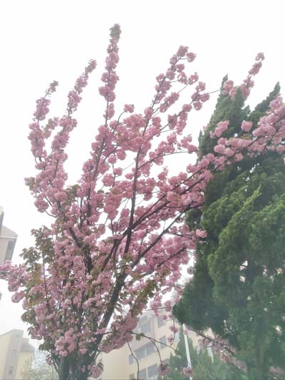 幼儿园门口有几株樱花树,下午刮了大风,等到接灿灿的时候,已经落了一大片。灿灿出来的时候,正好刮了一阵小旋风,带起地面的樱花花瓣在半空旋转飞舞。